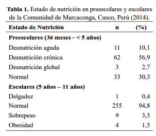 La desnutrición infantil es un problema de salud pública en el mundo, especialmente en países en vías de desarrollo (1). En el Perú la desnutrición crónica afecta a un porcentaje significativo de la población especialmente niños en zonas rurales, en la sierra y a los que se encuentran en el quintil inferior de extrema pobreza (2). Con el objetivo de determinar el estado nutricional en una población pediátrica de una comunidad rural de Cusco (Perú), se realizó un estudio transversal, descriptivo en la comunidad de Marcaconga ubicada a 3763 msnm, distrito Sangarará, provincia de Acomayo, departamento Cusco, calificada en el quintil I de pobreza (3). Se realizó la revisión de las historias clínicas de la totalidad de preescolares y escolares; pertenecientes a la posta de salud de dicha comunidad. Se incluyó en el estudio a niños y niñas con edades comprendidas entre 3 y 11 años de edad que residían como mínimo un año en la comunidad y que contaban con registros actualizados por lo menos de un mes de antigüedad de las variables a estudiar. Se excluyeron del estudio a los niños y niñas con antecedentes patológicos según su historia clínica.