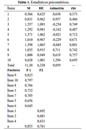 Para determinar la validez del instrumento, se realizó correlación ítem-test con el coeficiente de correlación de Pearson, obteniéndose valores entre 0,373 y 0,801, lo que indica que los ítems del instrumento son homogéneos. El análisis factorial para determinar la validez de constructo, arrojó un valor KMO de 0,860 y una prueba de esfericidad de Bartlett significativa (X2= 404,133; gl= 45, p < 0,000), lo que indica que la prueba puede someterse a factorización. Se aplicó así, el análisis factorial exploratorio mediante el método de componentes principales, encontrándose dos factores que explican el 55,69% de la varianza total de la prueba. El primer factor agrupa los ítems negativos (3,5-10) y explica el 38,52% de la varianza, mientras que el segundo factor agrupa los ítems positivos (1,2,4) explicando el 17,16% de la varianza total. Asimismo, el índice de confiabilidad mediante el método de consistencia interna con la prueba Alfa de Cronbach, fue de 0,853. Por tanto, se puede afirmar que la prueba utilizada es válida y confiable para la muestra de estudio (tabla 1).