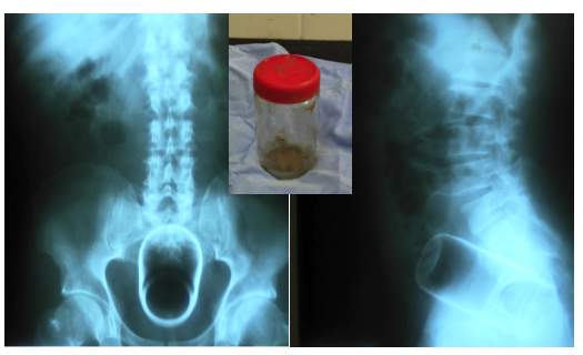 Varón de 65 años de edad que acudió a urgencias por presentar dolor a nivel rectal e imposibilidad para evacuar; al tacto rectal se palpaba objeto de consistencia firme. Se le realizó radiografía de abdomen anteroposterior y lateral cuyas imágenes se muestran (figura 1). Se procedió a pasar al quirófano y bajo un bloqueo peridural, se dilató el ano digitalmente y con una maniobra de Kristeller se extrajo el envase de vidrio con los dedos índice y pulgar. El paciente fue dado de alta con analgésico vía oral posterior a la recuperación de la anestesia.