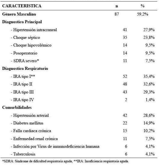 El estudio incluyó 147 pacientes con insuficiencia respiratoria aguda sometidos a destete de ventilación mecánica invasiva, que permanecieron hospitalizados en la UCI desde el primero de enero hasta el 31 de diciembre del año 2014. La edad promedio fue 51±20 años, 59% fueron varones; los diagnósticos de ingreso más frecuentes fueron hipertensión intracraneal (27%) y choque séptico (23%), el 35% de los pacientes ingresó por insuficiencia respiratoria aguda hipoxémica (IRA tipo I) (tabla 1). Al ingreso, el 51,2% de los pacientes usó vasopresores (dosis promedio de noradrenalina 0,15±0,1 µg/kg/min), las puntuaciones promedio de las escalas de evaluación de salud crónica y fisiología aguda (APACHE II) y de evaluación secuencial de falla de órganos (SOFA) fueron 19±7 y 7±3 puntos, respectivamente. (Error 1: La referencia: tabla 1 está ligada a un elemento que ya no existe)