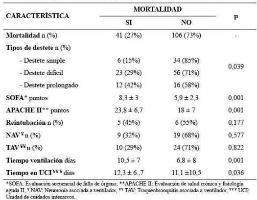 La mortalidad global en la UCI de los pacientes sometidos a destete de ventilación mecánica invasiva fue 27%, siendo mayor en el grupo de destete prolongado (42%) en comparación con los grupos de destete difícil (29%) y simple (15%) (p=0,039). Los pacientes que fallecieron tuvieron una puntuación de la escala SOFA de 8,3±3 versus 5,9±2 puntos (p=0,001) y APACHE II de 23,8±6,7 versus 18±7 puntos (p=0,001); la mortalidad global incrementó conforme aumentó la estancia en la unidad de cuidados intensivos 12,3±7 versus 11±10 días (p=0,036) y los días en ventilación mecánica 10,5±7 versus 6,8±8 días (p=0,001). La reintubación, la presencia de neumonía asociada a ventilador (NAV) y traqueobronquitis asociada a ventilador (TAV) no tuvieron relación estadísticamente significativa con la mortalidad global (tabla 2). (Error 2: La referencia: tabla 2 está ligada a un elemento que ya no existe)