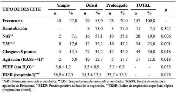 El destete difícil fue el grupo más frecuente (53%) en comparación al destete simple 27% y prolongado 20%; sin embargo, el destete prolongado se relacionó con mayor mortalidad. Se observó que, los pacientes con destete simple tuvieron niveles más altos de hemoglobina (OR: 0,83 IC [0,70-0,98] p=0,03) y más bajos de creatinina (OR: 0,39 IC [0,17-0,89] p=0,02);de los factores relacionados con fracaso del destete, se observó que el nivel de consciencia disminuido (Escala de Glasgow < 8puntos) y la agitación (Escala de sedación y agitación de Richmond [RASS] mayor de +1) se relacionaron con fracaso (p=0,018), el destete difícil se presentó en el 61,4% de los pacientes con Escala de coma Glasgow menor de 8 y en el 58,8% de los pacientes con agitación; otros factores no tuvieron relación estadísticamente significativa con el fracaso del destete. La NAV fue más frecuente en el grupo de destete difícil (57,1%) en comparación con los otros tipos de destete (p=0,006) y TAV más frecuente (47,2%) en el grupo de destete prolongado (p=0,001) (tabla 3). (Error 3: La referencia: tabla 3 está ligada a un elemento que ya no existe)