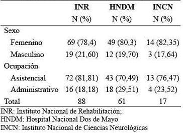 La muestra total estuvo conformada por 166 trabajadores, entre asistenciales y administrativos, con más de 2 años de antigüedad, nombrados y contratados, quienes fueron seleccionados de manera no probabilística de tres instituciones de salud de Lima Metropolitana: el Instituto Nacional Rehabilitación Dra. Adriana Rebaza Flores (INR; n = 88), el Hospital Nacional Dos de Mayo (HNDM; n = 61) y el Instituto Nacional de Ciencias Neurológicas (INCN; n = 17). En la submuestra INR, el promedio de edad fue 44,32± 8,33 y los participantes fueron predominantemente mujeres (78,4%). En la submuestra HNDM, el promedio de edades fue 42,93 ± 12,63 y también se contó principalmente con mujeres (80,3%) y en la submuestra INCN, el 82,35% fueron mujeres y la edad promedio de 41,81 ± 7,51.