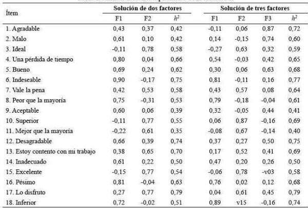 Al analizar la solución de dos factores, se aprecia que todos los ítems de puntuación inversa :2, 4, 6, 8, 14, 16, 18, cargaron en un solo factor. A excepción de los ítems 1, 5, 7 y 9, todos los ítems redactados de manera positiva cargaron en el segundo factor. La correlación entre ambos factores fue de 0,29.