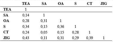 Otra explicación podría deducirse del análisis de correlación (tabla 3) realizado entre cada dimensión, en el cual se halló que la correlación entre la escala TEA y la JIG fue de un nivel moderado (r = 0,43) en comparación con las otras dimensiones que mostraron ser bajas. Este resultado concuerda con el estudio de McIntyre et al, quienes encontraron correlaciones entre bajas a moderadas, a excepción de la escala de TEA, la cual mostró una correlación alta (0,70) con la escala JIG (22). También en otro estudio se encontró una correlación alta entre estas escalas: 0,72 (26). Estos resultados concuerdan con lo observado en el presente estudio, lo que da cuenta de que cada factor es independiente uno de otro y que la escala JIG puede ser redundante respecto de la escala TEA, asumiendo que los participantes podrían haber observado dicha similitud o también haberse sentido sobrecargados (27) por la cantidad de ítems a resolver, hecho común cuando se trata de escalas multidimensionales en entornos organizacionales.