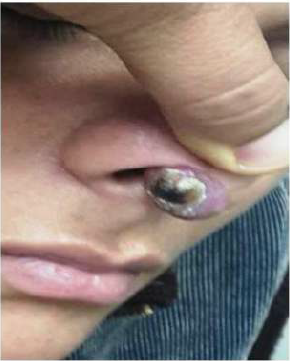 La paciente acudió al consultorio de otorrinolaringología al término de la gestación. Al examen, se observó una lesión de 1 cm de diámetro, lisa, con costra en su superficie que se inserta en zona superior y medial del vestíbulo nasal derecho (figura 1).