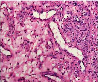 La extracción de la lesión por disección fría, se decidió a los 2 meses de terminado la gestación, Se le indicó prednisona 20 mg cada 12 horas por 5 días y cefalexina 500 mg cada 8 horas por 7 días, una semana previa a la intervención. El sangrado durante la intervención fue leve. El lecho operatorio fue cauterizado. Se colocó taponamiento con mechas de gasa en el vestíbulo derecho, el cual fue retirado a los tres días. El resultado de la anatomía patológica fue Hemangioma capilar lobular. (figura 2).