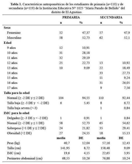 Estudio descriptivo, transversal y observacional, realizado durante el mes de noviembre del 2017, en escolares de ambos sexos, de una institución educativa del distrito de El Agustino en Lima, donde se aplicó un cuestionario y se evaluaron los parámetros antropométricos. Las edades oscilaron entre 9 a 13 años, en primaria (de cuarto al sexto año), y de 12 a17 años, en secundaria (de primero a quinto año), de acuerdo al listado de alumnos.