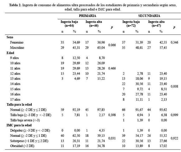 Se encontró diferencia significativa entre la ingesta de alimentos ultra procesados y frecuencia de sobrepeso y obesidad (p=0,031); no se encontró diferencias en sexo, edad, talla para edad y riesgo de enfermar (tabla 2).