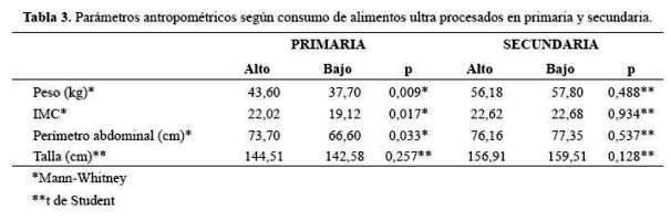 En este estudió se encontró asociación entre consumo alto de alimentos procesados y peso, IMC y perímetro abdominal, en escolares de primaria; no se encontró asociación con la talla. En los escolares de secundaria se encontró asociación entre el consumo alto de alimentos ultra procesados y edad; no se encontró asociación con parámetros antropométricos.