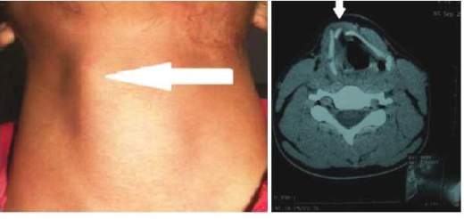 A 20-year-old male patient attended the emergency room after having a trauma on the neck. The physical examination revealed dysphonia and deviation of the cartilage thyroid to the right (figure 1). A direct laryngoscopy showed a small hematoma on the right side of the larynx with no active bleeding. A CT scan of the neck revealed fracture of the cartilage thyroid. Schaeffer EIII (displaced stable fracture). The patient was treated with steroids, antibiotics and observation for 24 hours not presenting respiratory distress. The patient was discharged to be followed monthly for one year, period in which he was asymptomatic and with no dysphonia.