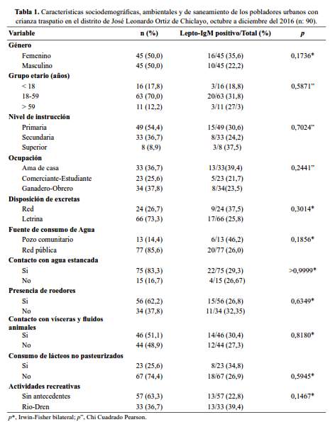 Participaron 90 personas de los sectores Culpón, Santa Ana y Miraflores del distrito de José Leonardo Ortiz, Chiclayo, Lambayeque. La muestra se caracterizó por poseer proporción equitativa en cuanto al sexo, y una media de edad de 37,7 ± 7,9 años. Las características sociodemográficas y ambientales se describen en la tabla 1.
