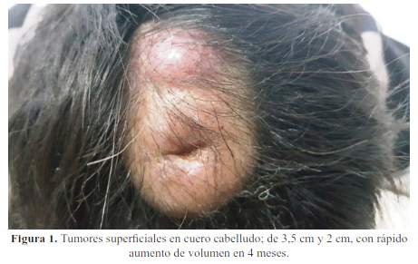 Varón de 13 años, mestizo, natural de Huánuco- Perú, que acudió a consulta con dos tumores superficiales, ubicados en el vertex: el más grande de3,5 cm. de diámetro del tono de piel del paciente, tenía una depresión en el centro por haber sido punzada con anterioridad y la segunda de 2 cm. de diámetro, de color eritemato-violáceo, de consistencia gelatinosa, ligeramente móviles y dolorosos a la palpación, con rápido aumento de volumen en cuatro meses (figura 1).