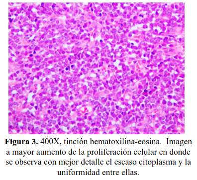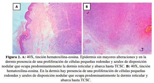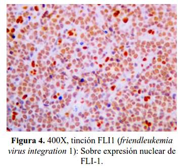Se realizó biopsia por losange del tumor 2 cm (más pequeño), cuya descripción histológica fue, epidermis sin mayores alteraciones y en dermis presencia de una proliferación de células pequeñas redondas y azules de disposición nodular que ocupa predominantemente la dermis reticular y abarca hasta TCSC (figura 2A y B, figura 3). Se realizó examen inmunohistoquímico FLI1 (friendleukemia virus integration 1), donde se aprecia sobre expresión nuclear de FLI-1 (figura 4).
