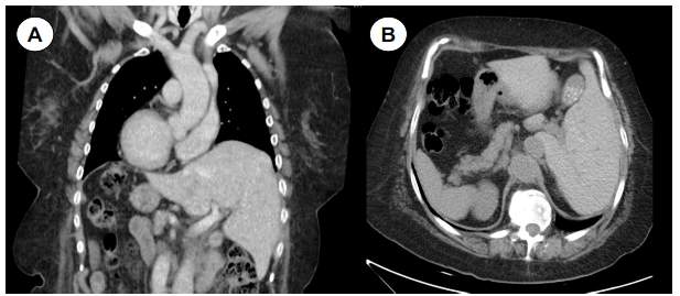 Mujer de 39 años con diagnóstico de cáncer epidermoide de cuero cabelludo, clínicamente asintomática. En el contexto de estadiaje de la enfermedad de fondo se solicitó tomografía de tórax y abdomen (figura 1). El corte coronal (A) mostró dextrocardia e hígado ubicado en hipocondrio izquierdo, no visualizándose la porción intrahepática de la vena cava inferior. En el corte axial (B), se observó hígado en hipocondrio izquierdo y bazo, cámara gástrica y páncreas de localización derecha. Bazo accesorio en hilio esplénico, que mide 15mm. Estos hallazgos corresponden a situs inversus, una variante de la normalidad