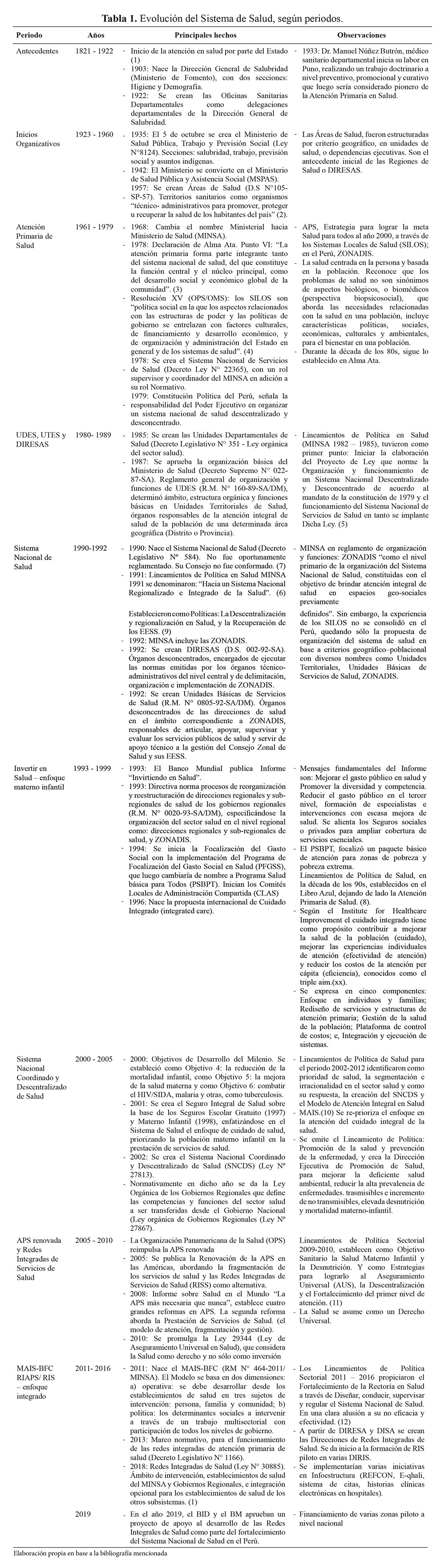Keywords: Primary health care, national health systems, intersectoral collaboration, organization and administration, Peru.
