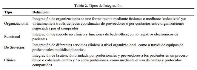 Se reconoce que la implementación y el desarrollo de las redes integradas de salud debe incluir los cuatro tipos de integración reconocidas: organizacional,funcional, de servicios y clínica (10). Este proceso de integración debe ser visto como un continuo en permanente mejoramiento, entre los tipos y al interior de cada uno de los mismos (tabla 2) (11).