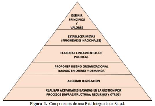 En la figura 1 se incluyen los componentes que deben ser considerados en la conformación de las Redes Integradas de Salud (RIS). Es prioritario que se cuente con una definición de los principios y valores,idealmente consensuados con los actores sociales claves, que deben regir el funcionamiento de las RIS. Simultáneamente, se deben establecer las metas - nacionales y regionales-, en función a las prioridades nacionales. En función a ello, se deberán elaborar los lineamientos de políticas, entendidas como health policies.