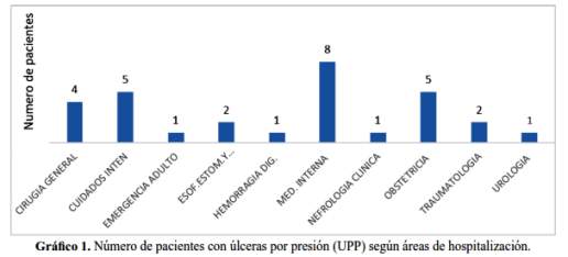 Conclusiones: Se encontró que la frecuencia de úlceras por presión se asoció con el servicio de hospitalización del paciente, siendo más frecuente en la unidad de cuidados intensivos. Más del 70% de los casos de UPP ocurrieron en la UCI, hospitalización de cirugía, medicina y obstetricia.