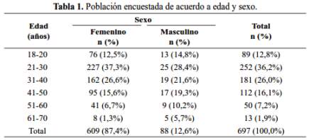 La población estudiada estuvo conformada por 697 personas; 609 (87,4%) fueron de sexo femenino, la distribución por edad muestra (tabla 1) que el 78,3% tenía entre 21 y 50 años. El 45,6% realizaba trabajos en el hogar; 20,7% trabajaban pero no recibían remuneración, 13,2% eran estudiantes y sólo el 11,9% tenían trabajo remunerado.
