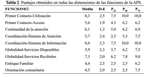 En la encuesta de evaluación de las funciones de la APS, los puntajes variaron de 2,5 a 10,0 en una escala de 10 puntos en todas las dimensiones (tabla 2). Usando como punto de corte siete, las mejores puntaciones fueron en las funciones de Coordinación- Sistemas de información, Primer Contacto-Utilización y Globalidad-Servicios recibidos. En las demás funciones, los puntajes promedios estuvieron por debajo de siete, indicando debilidades o situaciones que tienen margen de trabajo para conseguir mejoras. Los atributos con menores calificaciones de desempeño fueron Enfoque Familiar, Orientación Comunitaria y Primer Contacto-Acceso.
