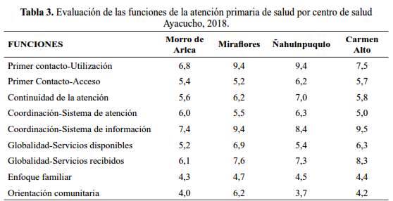 Análisis estadístico: Se utilizó estadística descriptiva para hallar las puntuaciones de los atributos y para la comparación de los resultados de los centros de atención primaria de salud, se usó el análisis de varianza y pruebas de comparaciones múltiples como la prueba de Scheffé; se consideró significativo un p<0,05.
