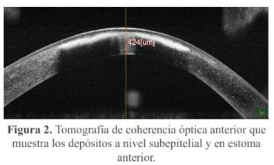 La agudeza visual preoperatoria corregida del ojo derecho fue de 0,5 y de 0,8 en el ojo izquierdo. Al mes, la agudeza visual corregida se mantuvo igual. A la biomicroscopia del ojo derecho, se observó depósito blanquecino en el área subepitelial corneal y del estroma anterior central con presencia de espacios no comprometidos. No había inyección conjuntival y la cámara anterior no presentaba alteraciones ni signos de infección o inflamación (figura 1). El examen de tomografía de coherencia óptica anterior comprobó la localización en el estroma anterior y subepitelial corneal de los depósitos (figura 2).