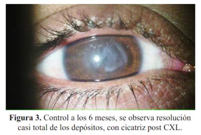 Se disminuyó la dosis de fluorometalona a dos veces al día por quince días asociada a metilcelulosa 1% tres veces al día. Durante los siguientes seis meses los depósitos corneales se fueron reabsorbiendo gradualmente, persistiendo aún la cicatriz producida por el CXL (figura 3).