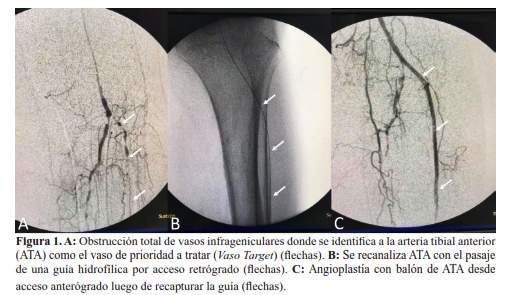 La revascularizacion endovascular junto a la curacion de heridas son consideradas en la actualidad, como la piedra angular de salvataje del pie diabético; debido a que se restituye adecuadamente el flujo sanguineo a zonas de la extremidad en donde antes no lo hubo, permitiendo contrarrestar los grados de isquemia crónica y propiciando la cicatrización exitosa de las heridas (5,6). Para lograr todo este proceso terapéutico, el cirujano vascular y endovascular hace uso de una serie de herramientas que incluyen guías, catéteres, balones medicados, stens con droga y equipos de aterotomía, según la localización (Vaso Target y angiosoma), tipo y abordaje (anterógrado, retrógrado o contralateral) de la lesion a tratar (figura 1) (7,8); por lo tanto, este proceso ha sido descrito como un verdadero desafío terapéutico debido a que se requiere una minuciosa planificación e innovacion de técnicas quirúrgicas teniendo en cuenta permanentemente la cartografía vascular a tratar (9,10).