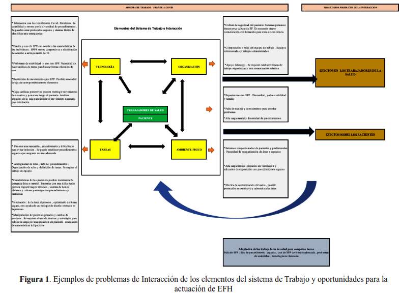 Este sistema de trabajo está conformado por los siguientes elementos: las tareas, la organización, el ambiente, la tecnología y en el centro interactuando con cada una de ellas, el humano. En el actual contexto de la pandemia por Covid-19 esta dinámica entre elementos se ve afectada especialmente por la agresividad del virus lo cual obliga al sistema a responder rápidamente a pesar de sus debilidades. Para enfrentar las debilidades del sistema usualmente los TS deben enfrentar las carencias con sus propios recursos adaptándose de manera reactiva a los sistemas poniendo en riesgo su propia vida (4). Por esta razón, es necesario que estos ajustes sean favorables y la EFH contribuye significativamente.