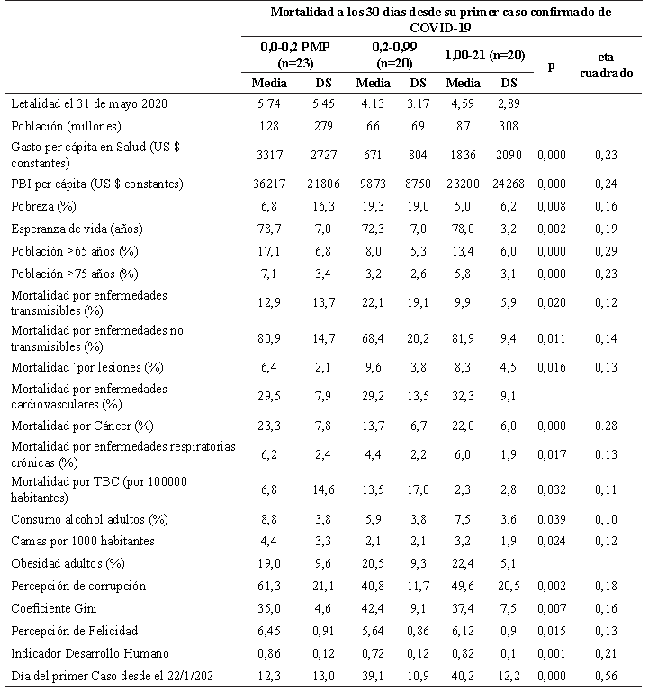 El análisis se realizó comparando medias por terciles de la mortalidad e incidencia a los 30, 60 y 75 días desde su primer caso aplicando el estadístico ANOVA y el estadístico eta cuadrado para evaluar la relevancia de la significancia estadística en las variables que la tuvieran. La letalidad se estudió mediante correlación lineal con las variables antes mencionadas de cada país. Se consideró significancia estadística un p<0,05. Los resultados son presentados como tablas de contingencia y gráficos según sea lo conveniente.