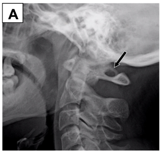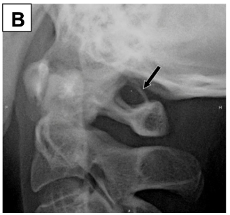 Se presentan dos pacientes, un varón de 35 años (A) y una mujer de 32 años (B), con cervicalgia crónica. En la radiografía lateral de columna cervical se encontró un puente óseo sobre el agujero de la arteria vertebral C1, característico de pontículus posticus. Se postula que el pontículus posticus surge de la osificación del segmento lateral del ligamento atlanto occipital superior, siendo unilateral o bilateral. Puede ser un hallazgo imagenológico incidental en un paciente asintomático; sin embargo, puede provocar isquemia vertebro-basilar, vértigo, cervicalgia y cefalea. Entre los hallazgos, en la radiografía lateral de cuello se evidencia una calcificación parcial o completa sobre el techo óseo del agujero de la arteria vertebral C1, tal como se encontró en ambos casos, por lo que es importante tener en cuenta este hallazgo e informarlo en pacientes que cursen con algunos de los síntomas descritos.