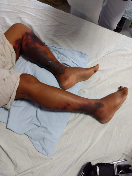 Mujer de 45 años de edad, procedente de El Paraíso, Honduras, ocupación costurera. Acudió a emergencia del Hospital Escuela Universitario de Tegucigalpa por presentar fiebre, de tres días de evolución, no cuantificada, subjetivamente alta, sin predominio de horario, malestar general y dolor localizado en miembros inferiores de tipo urente que se acompañaba de lesiones violáceas, tipo placas en ambos miembros inferiores (figura 1). Tenía diagnóstico de hipertiroidismo desde hace dos años, manejado en Hospital General San Felipe, con propiltiouracilo (PTU) 450mg vía oral cada día y propranolol 40 mg vía oral cada día; la última cita médica había sido hace más de 1 año. Historia ginecobstétrica: G: 2 P: 2, ciclos regulares.