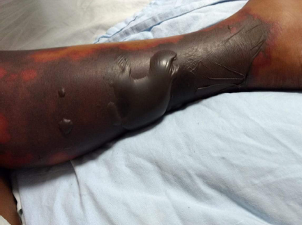 Posteriormente, la paciente presentó bulas en miembros inferiores, acompañadas de secreción purulenta y fétida por lo que recibió tratamiento antibiótico con clindamicina 600 mg intravenoso c/8h, por 7 días (figura 2). Permaneció hospitalizada en el servicio de medicina interna, al décimo día intrahospitalario se realizó tiroidectomía total como tratamiento definitivo de su hipertiroidismo y limpieza quirúrgica de miembros inferiores afectados; no hubo complicaciones en el post operatorio, la evolución fue adecuada. Salió de alta al tercer día post operada con tratamiento ambulatorio con levotiroxina 100 mg vía oral cada día.