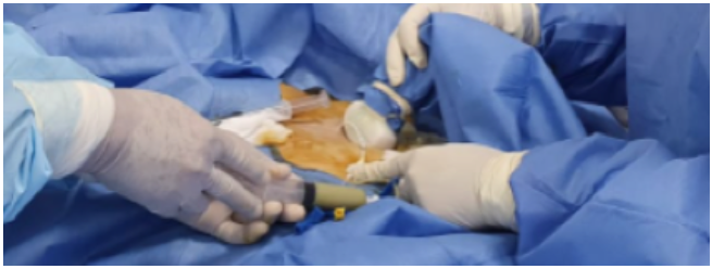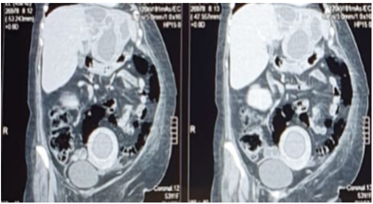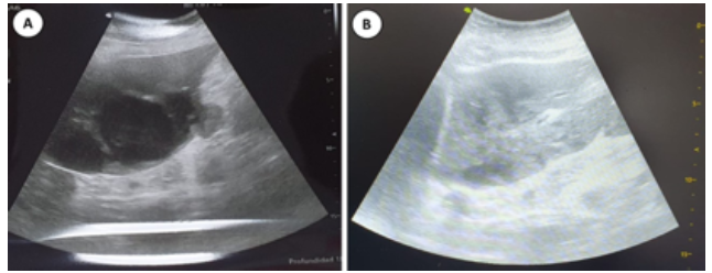 Recibió tratamiento antibiótico con meropenem 2 gr cada 8 h, insulina en infusión, soporte vasopresor, ventilación mecánica protectora con volumen tidal 6 ml/kg peso ideal, presión plateau 26, driving pressure 12 (tabla 3). Asimismo, se realizó drenaje percutáneo del absceso hepático, a la cabecera de la paciente con guía de ultrasonografía por el personal asistencial de cuidados intensivos; se drenó 200 ml de líquido verdoso purulento viscoso, sin complicaciones (figura 1, 3, 4). La evolución clínica fue favorable, la fiebre cedió, la leucocitosis disminuyó a menos de 10 000 x mm3; se retiró los vasopresores, se extubo, y salió alta de UCI y del hospital.