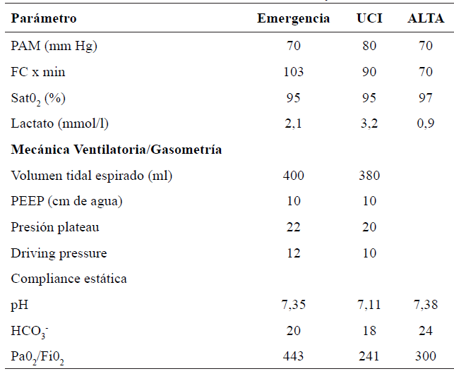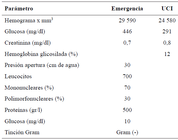 Ingresó a la unidad de cuidados intensivos (UCI) intubada, con apoyo ventilatorio, con noradrenalina 0,01 ug/kg/min, score APACHE II 22, SOFA 10, PA 140/70 mm Hg, FC 68 x min, T 37,2°C, Sat02 95%, llenado capilar < 2 segundos, hemograma con leucocitosis 24 580 x mm3 con abastonados 15%, linfocitos 750 xmm3 , glucosa 260 mg/dl, creatinina 0,8 mg/dl, calcio iónico 1,01 mmol/l, deshidrogenasa láctica (DHL) 421 U/l, transaminasa pirúvica (TGP) 13 mg/dl, sodio 155 mEq/l, cloro 116 mEq/l, HCO3-18, anión GAP 21, lactato 3,2 mmol/l, Pa02/Fi02 240; el cultivo de LCR y hemocultivo por 2 fueron positivos a Klebsiella pneumoniae con prueba de cuerda (“string test”) 7 mm.