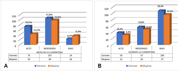 Se evidenciaron cambios en el patrón de los niveles de actividad física durante la cuarentena, siendo los más frecuentes el nivel bajo y moderado, en relación a antes de la cuarentena que se encontró al nivel moderado y alto con mayores porcentajes (p < 0,001) (figura 1).