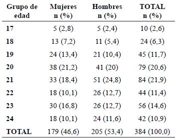 Participaron 384 estudiantes, de los cuales 46,6% fueron mujeres. El 53,9% de los encuestados tenía entre 20 y 22 años (tabla 1). El 95% residían en la ciudad de Trujillo y el porcentaje restante, se encontraba en la sierra de la región La Libertad.