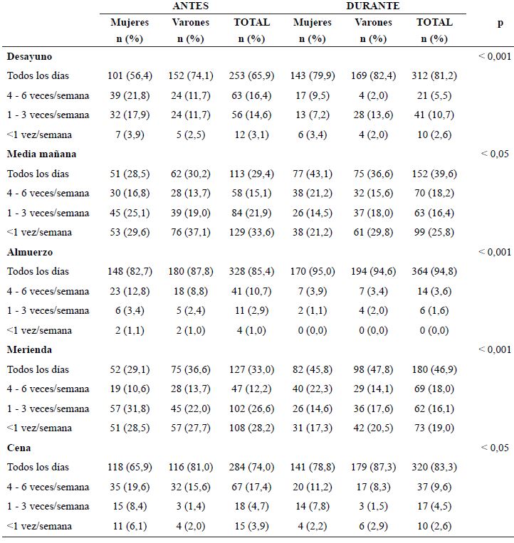 En el presente estudio, durante la cuarentena por la COVID-19, se encontró cambio en la distribución de frecuencia de consumo: desayuno, media mañana, almuerzo, merienda y cena. Esto coincide con lo reportado en otros estudios sobre una mayor ingesta de alimentos (7,16,17); siendo una de las razones según señala Eric y col., el consumo principal de bocadillos dentro de las comidas con mayor frecuencia (7), y una tendencia al consumo de algún refrigerio durante la noche (10).