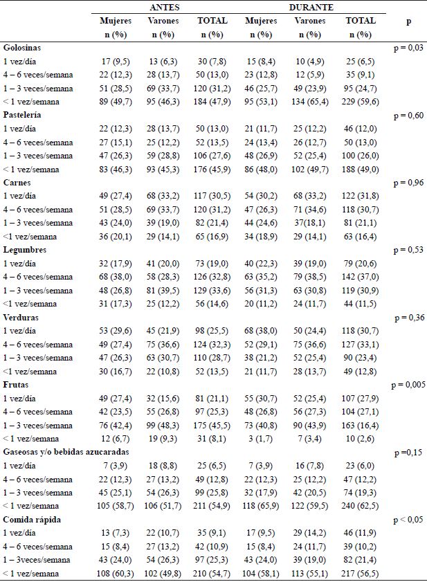 Los cambios en las conductas alimentarias durante la cuarentena por COVID-19 presentaron un aumento significativo del número de comidas al día, tanto en el desayuno (p < 0,001), media mañana (p < 0,05), almuerzo (p < 0,001), merienda (p< 0,001) y cena (p < 0,05) (tabla 2). Asimismo, durante la cuarentena por COVID-19 hubo un incremento significativo de frutas (p = 0,005), y sin cambios en la ingesta de gaseosas o bebidas azucaradas, verduras, legumbres, carnes, pastelería; incluso, los participantes consumieron en mayor medida comida rápida (p < 0,05) y golosinas (p = 0,03) antes de la pandemia (tabla 3). La percepción de los participantes respecto a los comportamientos del control de peso muestra una variación en relación con el período de cuarentena por COVID-19, se incrementaron las interrupciones de sueño en el 38,8% de participantes y los cambios de horarios en el 59,9%. No se observan variaciones relevantes en los otros ítems (tabla 4).