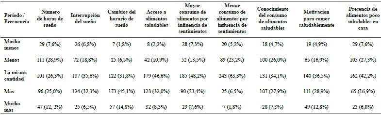 Se encontró un incremento en la distribución de frecuencia de comidas diarias, cambios en las preferencias alimentarias con mayor consumo de frutas y una disminución de comidas rápidas y golosinas. El nivel de actividad física disminuyó significativamente. La salud mental fue afectada por incremento de soledad, depresión, ansiedad, ganas de hacerse daño, pensamientos suicidas, síntomas de salud física, conflictos o discusiones y sentimientos negativos.