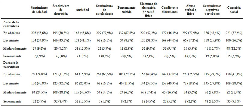 La salud mental durante la cuarentena por COVID-19 presentó un incremento significativo de soledad (p < 0,001), depresión (p < 0,001), ansiedad (p < 0,001), ganas de hacerse daño (p = 0,000356), pensamientos suicidas (p=0,0083), síntomas de salud física (p < 0,001), conflictos o discusiones (p < 0,001) y sentimientos negativos por el peso presentado en este período (p < 0,001) (tabla 5).