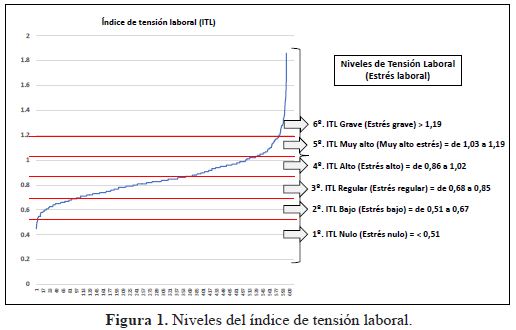 El índice de tensión laboral presentó un comportamiento creciente, posteriormente la curva es asíntota al eje de las X y continua con una tendencia creciente. En la figura 1 se muestran los seis niveles de tensión laboral (estrés laboral): nulo, bajo, regular, alto, muy alto y grave.