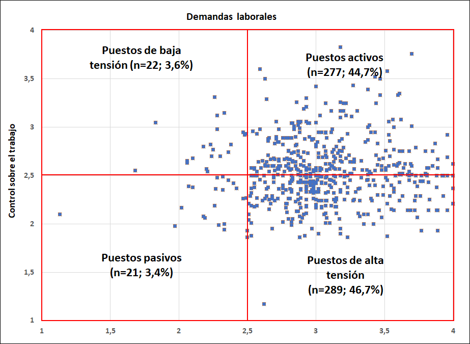 Karasek (4) propone la relación de los factores de demandas/control en un diagrama con cuatro cuadrantes el cual se puede construir utilizando las puntuaciones medias de estos dos factores, generando cuatro tipos de trabajos, ocupaciones o profesiones: trabajos activos, trabajos pasivos, trabajos de alta tensión y trabajos de poca tensión.