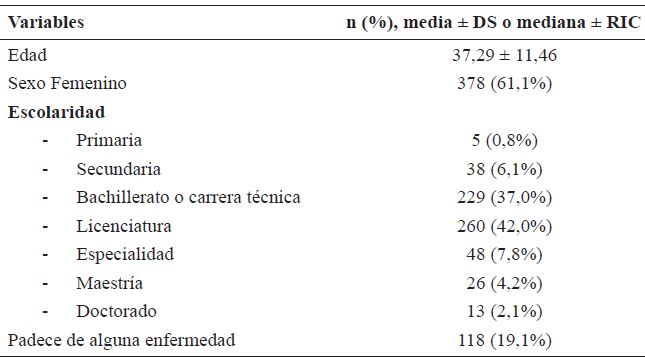 Aplicación de la EDCA para determinar las propiedades psicométricas de la escala. La aplicación de la escala se efectuó a una muestra intencional de 619 trabajadores mexicanos. Los criterios de inclusión fueron: ser trabajadores activos de los sectores educativo, salud, gubernamental y de empresas privadas, y tener al menos seis meses de antigüedad laboral. Los criterios de exclusión fueron, ser trabajadores con antigüedad menor a seis meses, trabajar en otros sectores diferentes a los mencionados y ser trabajadores informales. Las características de la muestra se presentan en la tabla 1. Los participantes tenían en promedio 37,29 años, 61,1% del sexo femenino, 66,4% tenían pareja, 60,1% tenían hijos, el 67,8% trabajaban en puestos de nivel operativo, 25,4% en mandos medios y el 3,7% en puestos directivos. La escala se aplicó a cada trabajador, previo a obtener su consentimiento y el de la organización donde trabaja.