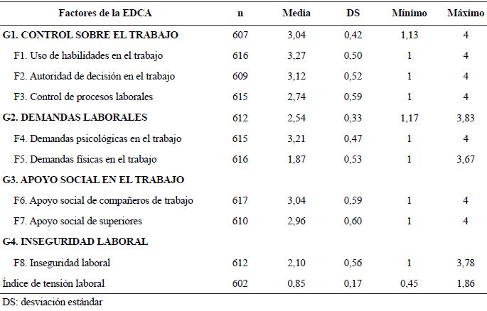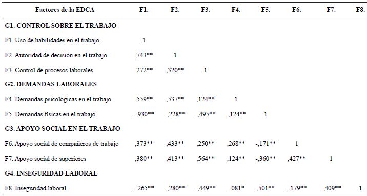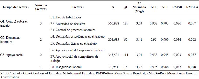 Determinación de los factores y la estructura factorial de la EDCA. La escala quedó conformada de ocho factores de los cuales tres corresponden al G1. Control sobre el trabajo (F1. Uso de habilidades en el trabajo, F2. Autoridad de decisión en el trabajo, F3 Control de procesos laborales), dos al G2 Demandas laborales (F4. Demandas psicológicas en el trabajo y F5. Demandas físicas en el trabajo), dos factores en el G3. Apoyo social (F6 Apoyo social de los compañeros de trabajo y F7 Apoyo social del superior inmediato) y el F8 de Inseguridad laboral.
