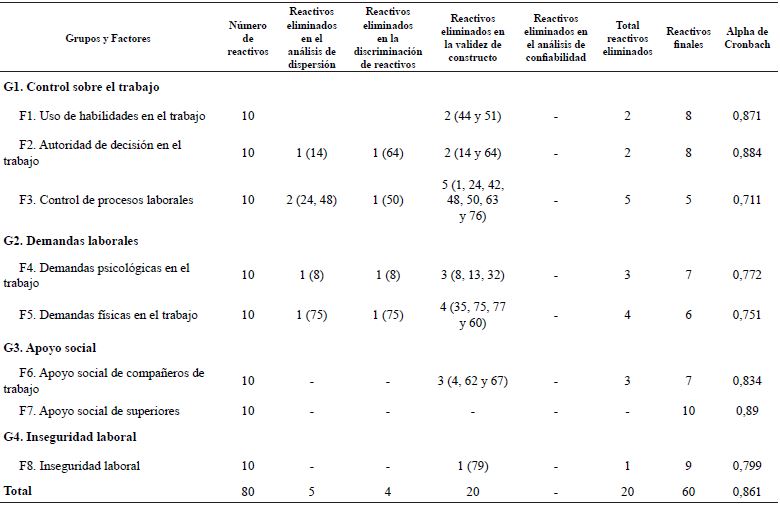 En un primer análisis de la validez de constructo, se validaron tres factores del grupo de control sobre el trabajo: F1 uso de habilidades en el trabajo con 8 reactivos, F2 autoridad de decisión en el trabajo con 8 reactivos y el F3 control de procesos laborales con 5 reactivos. En un segundo análisis se validaron los dos factores del G2 demandas laborales. El F4 demandas psicológicas en el trabajo se validó con 7 reactivos y el F5 demandas físicas se validó con 6 reactivos.
