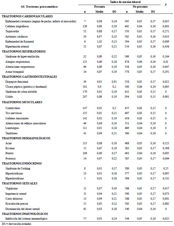 Para identificar el índice de tensión laboral con la presencia de trastornos y síntomas psicosomáticos se efectuó el análisis t student. En la tabla 6 se puede observar el índice de tensión laboral promedio en los que presentan alguno de los trastornos psicosomáticos y en los que no lo presentan. Se encontró diferencia significativa en: enfermedad coronaria, cefaleas migrañosas, arritmias cardiacas, enfermedad de Raynaud, alergias respiratorias, alteraciones respiratorias, dispepsia funcional, ulcera péptica, síndrome de colon irritable, colitis, contracturas, tics nerviosos, cefaleas tensionales, alteraciones de reflejos musculares, lumbalgias, temblores, prurito, vaginismo, coito doloroso, disminución del deseo sexual e inhibición del sistema inmunológico.