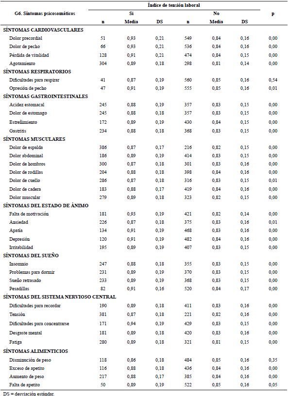 En la tabla 7 se presenta el índice de tensión laboral promedio, según presencia o ausencia de síntoma psicosomático. Se encontró diferencia significativa en los siguientes síntomas psicosomáticos: dolor precordial, dolor de pecho, pérdida de vitalidad, agotamiento, opresión de pecho, acidez estomacal, dolor de estómago, estreñimiento, gastritis, dolor de espalda, dolor abdominal, dolor de hombros, dolor de rodillas, dolor de cuello, dolor de cadera, dolor muscular, falta de motivación, ansiedad, apatía, depresión, irritabilidad, insomnio, problemas para dormir, sueño retrasado, pesadillas, dificultades para recordar, tensión, dificultades para concentrarse, desgaste mental, fatiga, exceso de apetito, aumento de peso y falta de apetito.