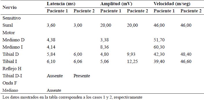 Mujer de 28 años, sin antecedentes patológicos de importancia, acudió a la consulta externa por neurología, refiriendo haber presentado síntomas respiratorios dos semanas antes, con prueba rápida para SARS-CoV 2 positiva, y hospitalizada por presentar deterioro clínico, pero dada de alta a los pocos días en buenas condiciones. Refirió que cinco días después de presentar el cuadro respiratorio presentó debilidad en miembros inferiores y dificultad para la marcha (no dependiente) tipo atáxica con leve ampliación de la base de sustentación e inestabilidad. Un día antes de venir a nuestro servicio se agregó debilidad en miembro superior derecho. Al examen físico se encontró una paciente lúcida con triparesia 4/5, hiporrefléxica y con signo de Lasségue negativo bilateral. El LCR fue normal. Los estudios de VCN y EMG (tabla 1) mostraron latencias motoras distales elongadas, con surales sensitivos y reflejo H normal en ambos lados, siendo compatible neurofisiológicamente con SGB variante AIDP (polineuropatia desmilienizante inflamatoria aguda). Funcionalmente se encontraba en Hughes II, por lo que no se consideró necesario tratamiento inmunomodulador al momento de la evaluación.